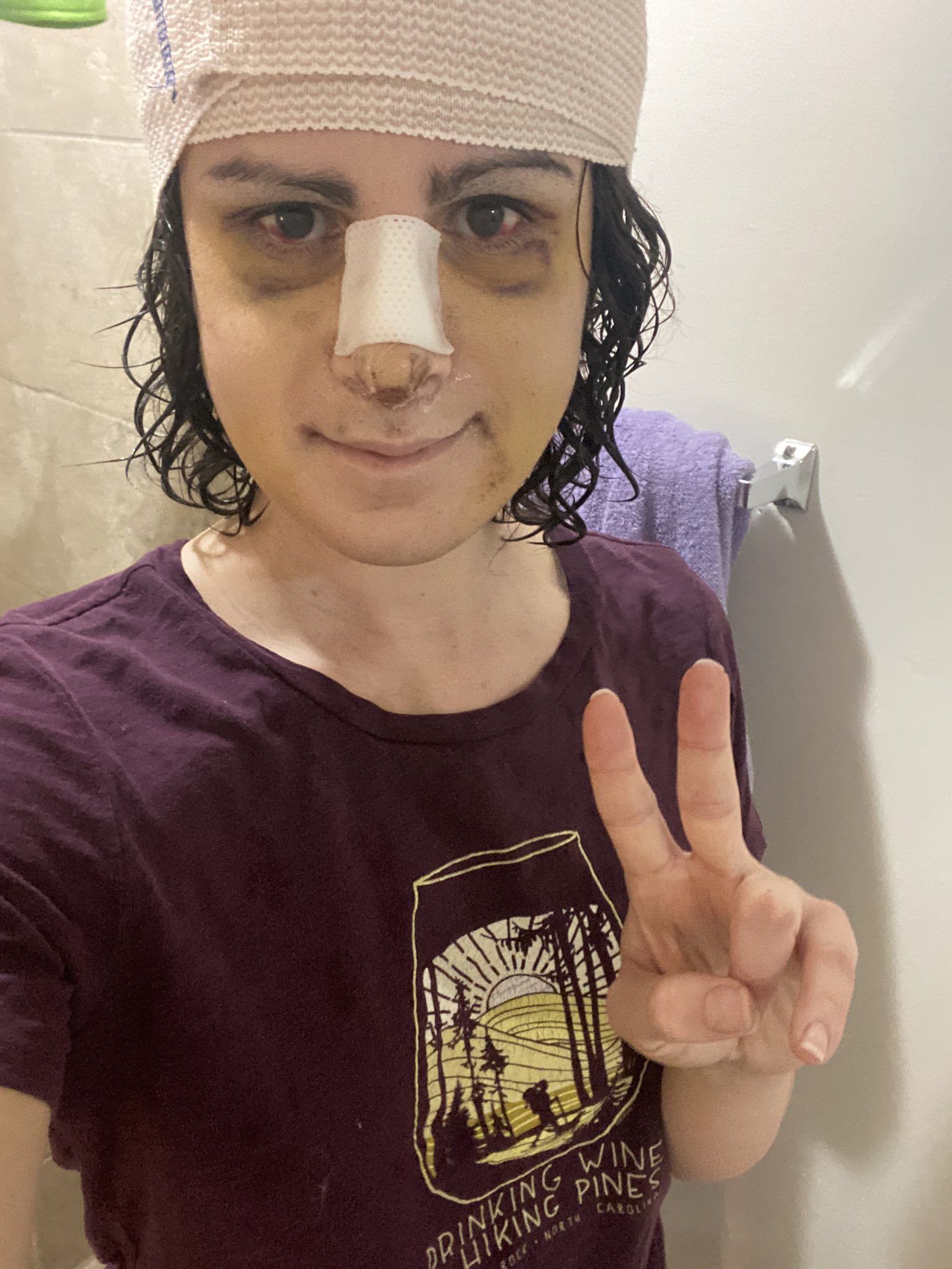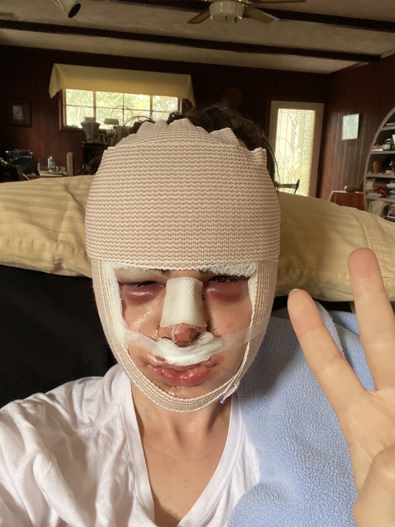 I left a few hours later with my face/head very tightly wrapped. This wrapping the first two days was probably the most uncomfortable thing about the whole ordeal. My eyes swelled shut and it was the cause of a significant portion of my pain. There was an issue with obtaining pain medicine though and I remember Dr. Kuperstock loudly and angerly advocating for me to the pharmacy which they ultimately complied with. That won him points in my book too.